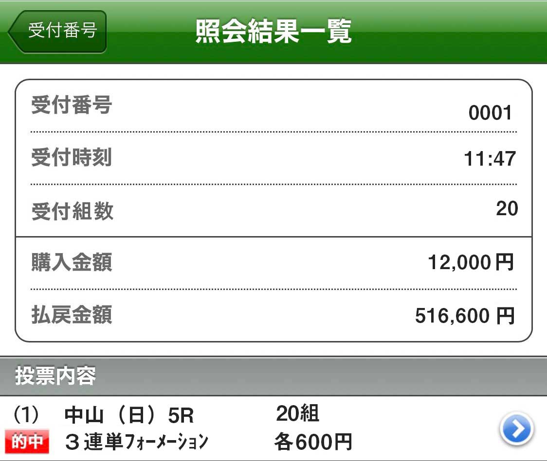 しかも中山5Rで、ただ人気馬を並べただけじゃなく、7番人気の8番を頭に置いて、2番人気の3番は相手、さらに9番人気の15番まで残して三連単8万6100円を取っているので、馬券の組み方としてかなりうまいです。