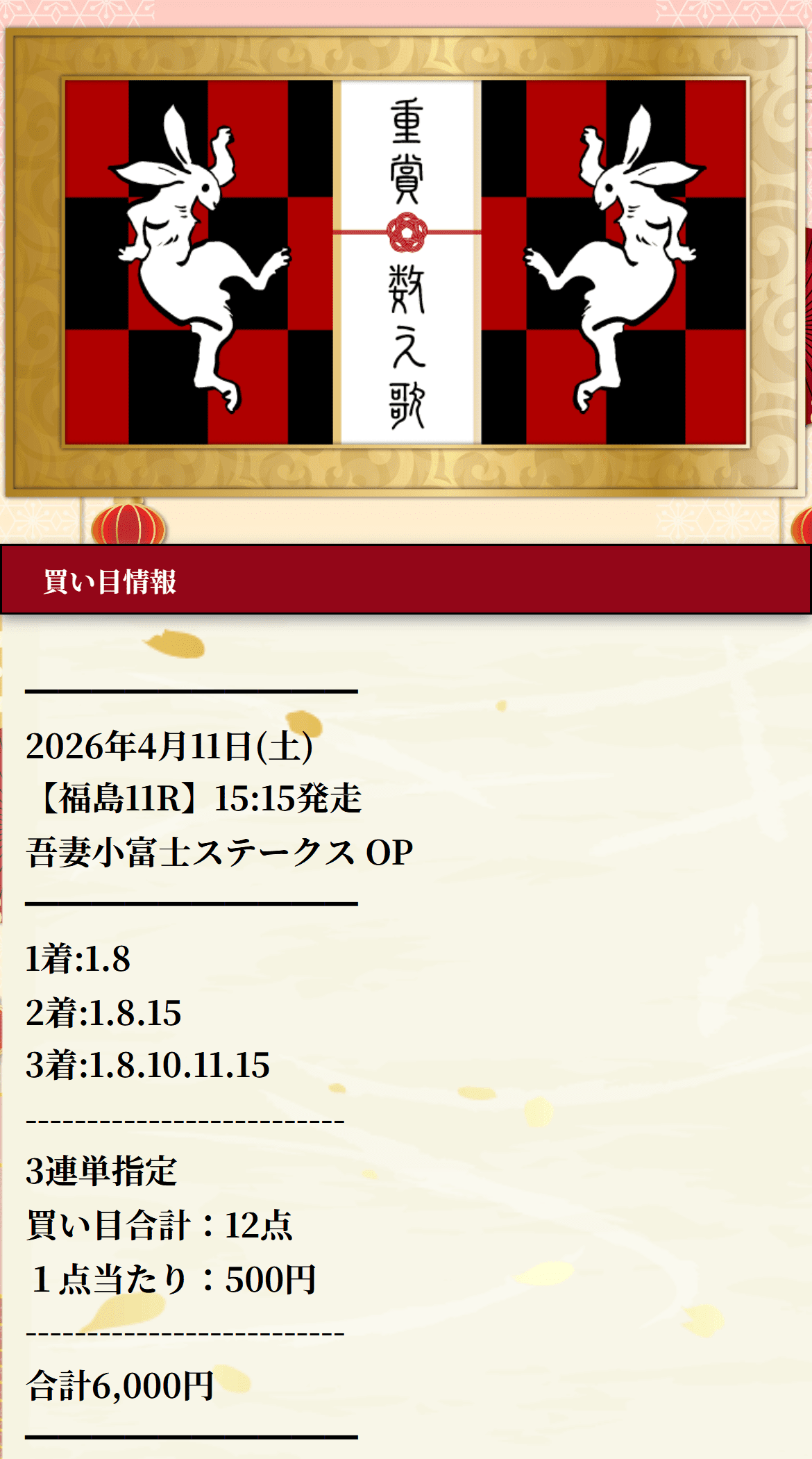 暁の重賞数え歌は、その吾妻小富士ステークスで5番人気のラタフォレストを頭に置いて、さらに2着8番人気、3着4番人気まで拾っているのがうまかったです。三連単は982.0倍、配当額は49万1000円。重賞やOPって、みんな注目するぶん逆に無難な組み方に流れやすいのに、この買い目はちゃんと配当を作る側の組み方になってた。読んでる側も「ああ、あの吾妻小富士Sか」ってなるし、そのうえでこの取り方なら印象に残ります。