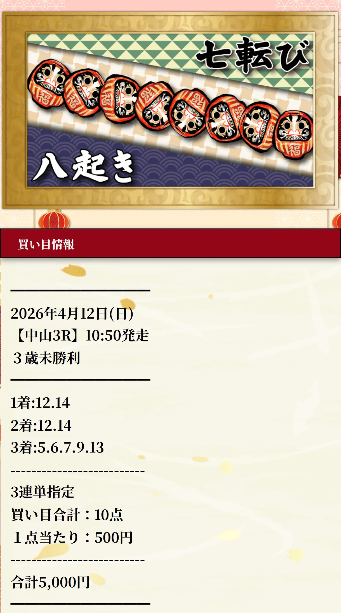 暁の七転び八起、中山3Rで12番と14番をそのまま1、2着ゾーンに固定して通してるのが気持ちいい。二頭軸っぽい形って簡単そうに見えて、実際はけっこう怖いじゃないですか。そこをブレずに押し切って、三連単758.5倍、配当額37万9250円。しかも1着の12番は6番人気、2着の14番は2番人気、3着の5番は1番人気で、人気の置き方もいやらしいくらいちょうどいい。大穴だけで夢を見せる感じじゃなくて、ちゃんと形にして回収してるのがよかったです。